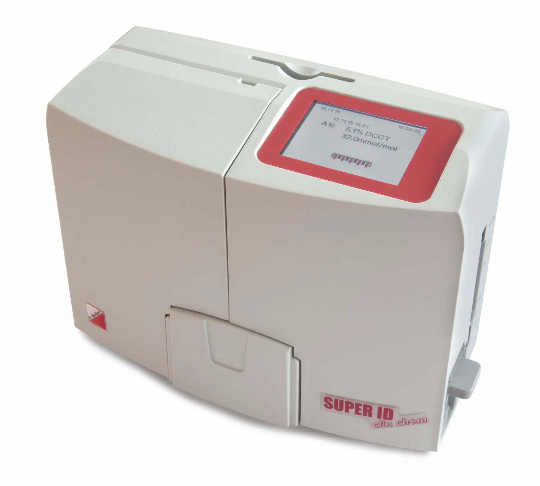 It is a clinical chemistry analyser for near patient testing using immunoturbodimetric principle for HbA1c and CRP and it has a fully automated procedure for dilution, mixing, incubation and measuring. Calibration for parameters are stored on a chipcard delivered with reagent kit and 9 months stable.